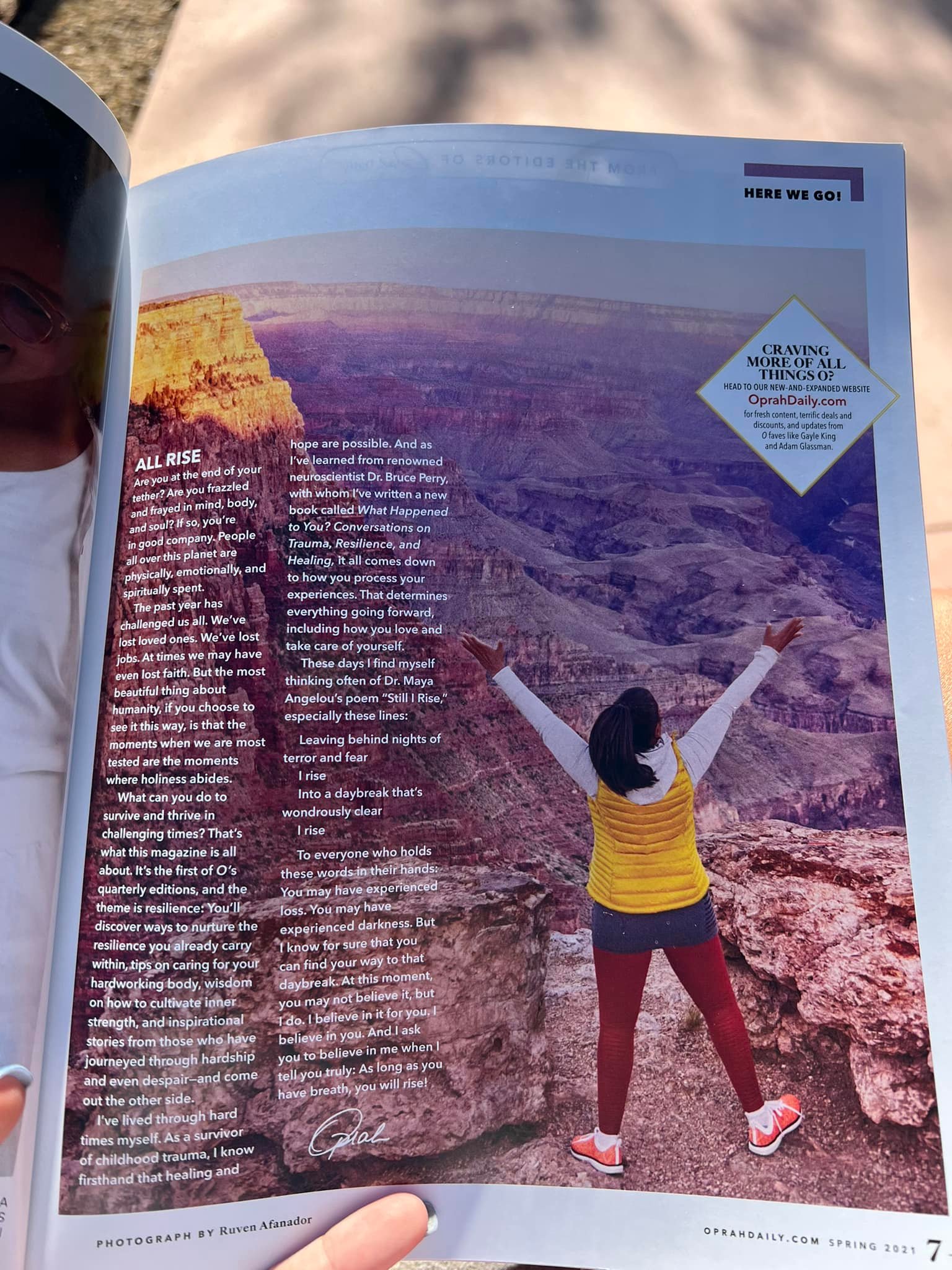 Between appointments you could find me in the Mayo Hospital garden, tears running down my face, as I read Oprahโs take on resilience and see a picture of her at the Grand Canyon quoting Dr. Mayo Angelou: